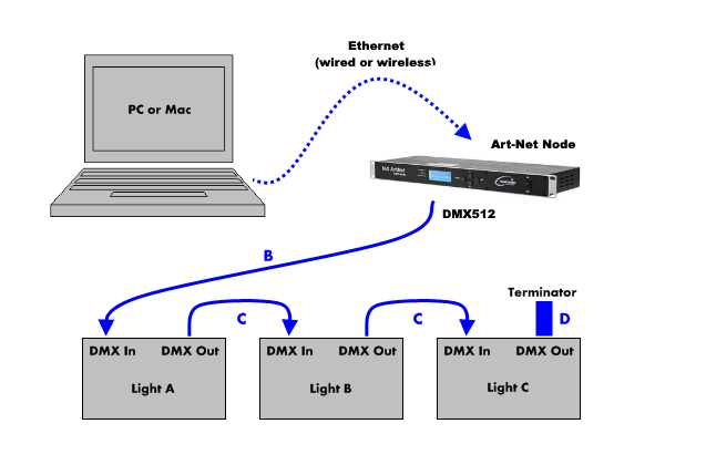 To get Art-Net data into your lights, you use hardware devices known as an Art-Net nodes. These can turn the ArtNet data into a DMX signal (which you then plug into your lights). Art-Net nodes are also available which wirelessly convert Art-Net data for strips of pixel tape. With Art-Net, you have much more flexibility in how you design and connect your lighting system.